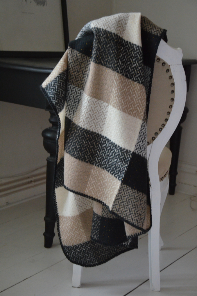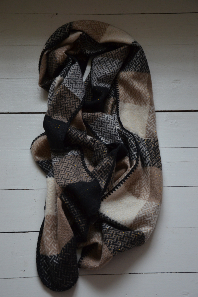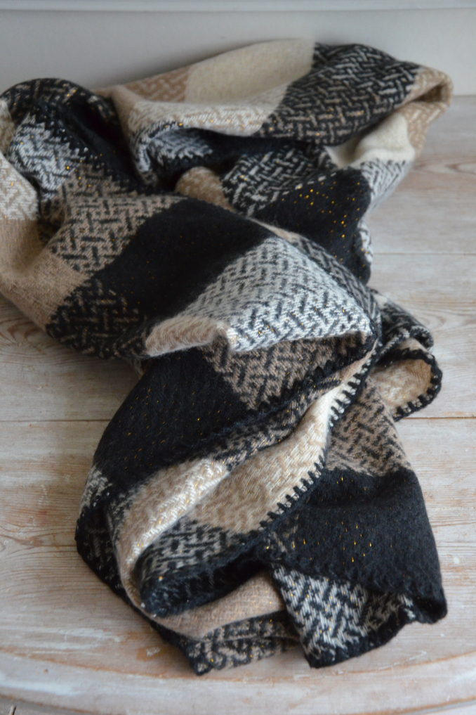 Ett fint inslag av guldtråd blänker diskret i denna snygga halsduk i svart, beige, offwhite!