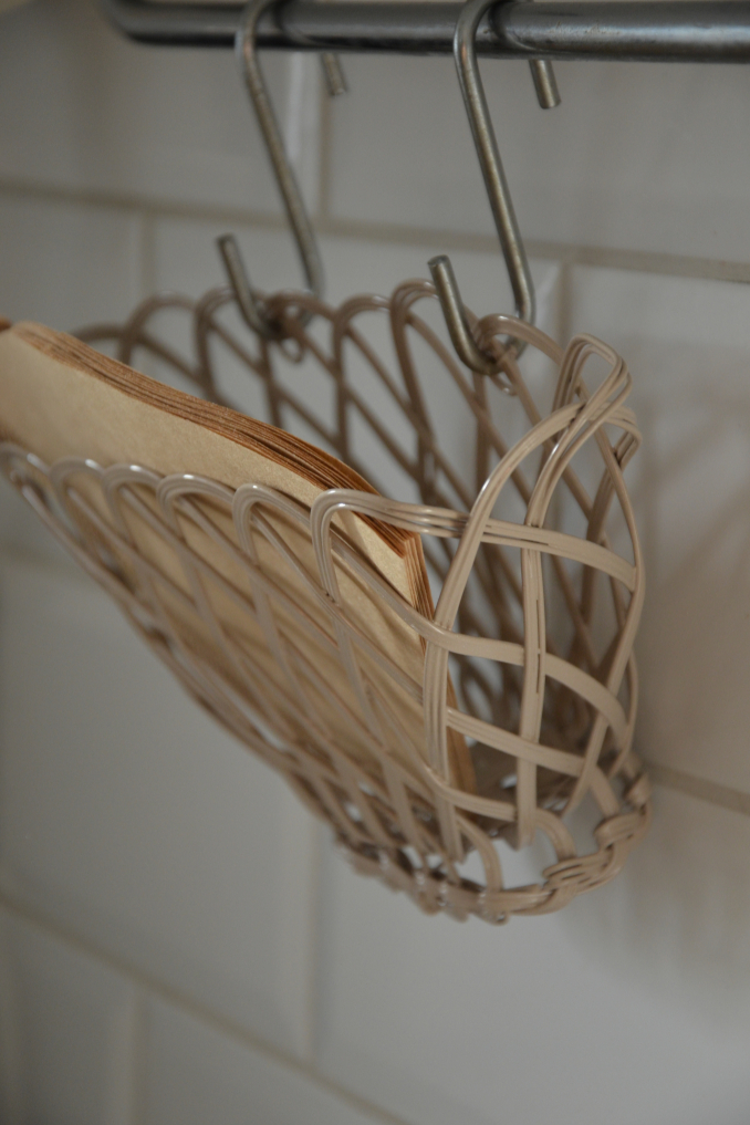 Kaffefilter hållaren är i trådkorgsdesign, kan både stå fritt på köksbänken eller kaffehyllan och kan hängas upp.