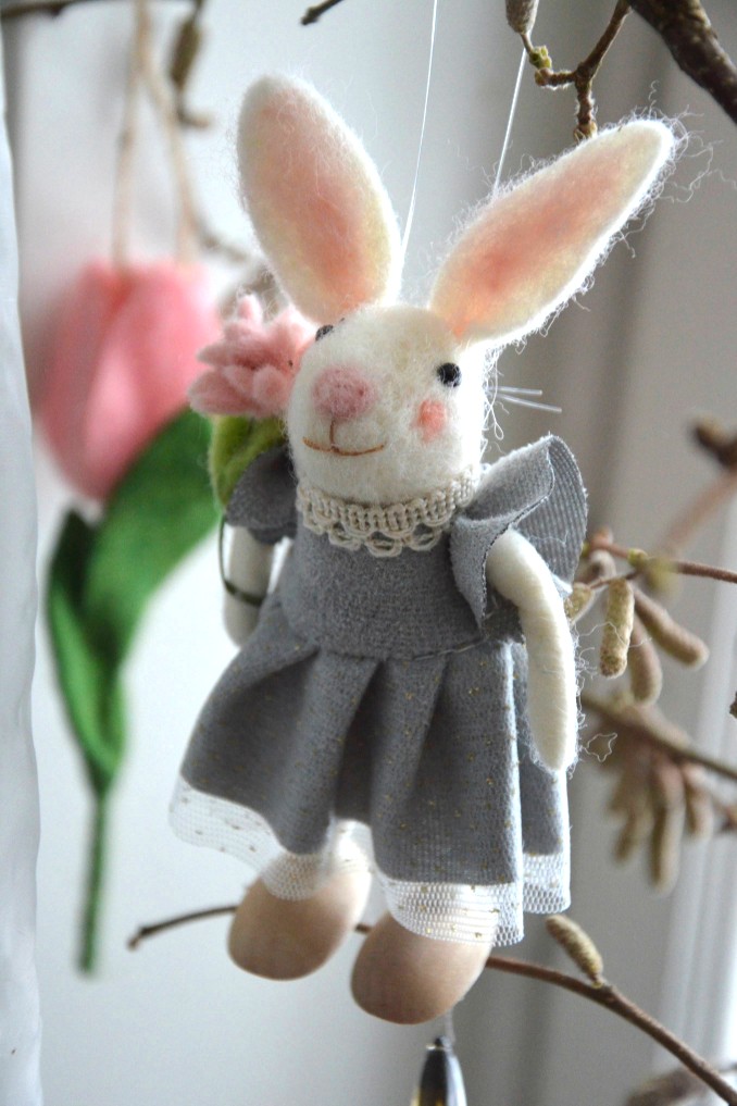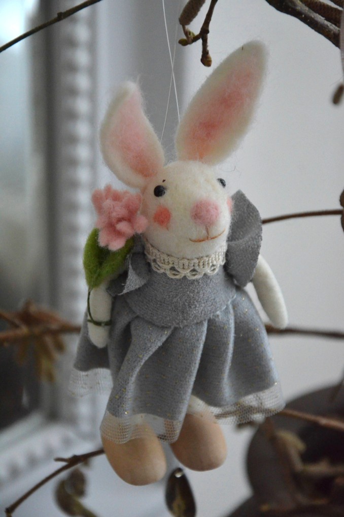 Bedårande söta vårkaninen med detaljer som tex klänning med glitterkjol, bukett i handen, spetskrage mm