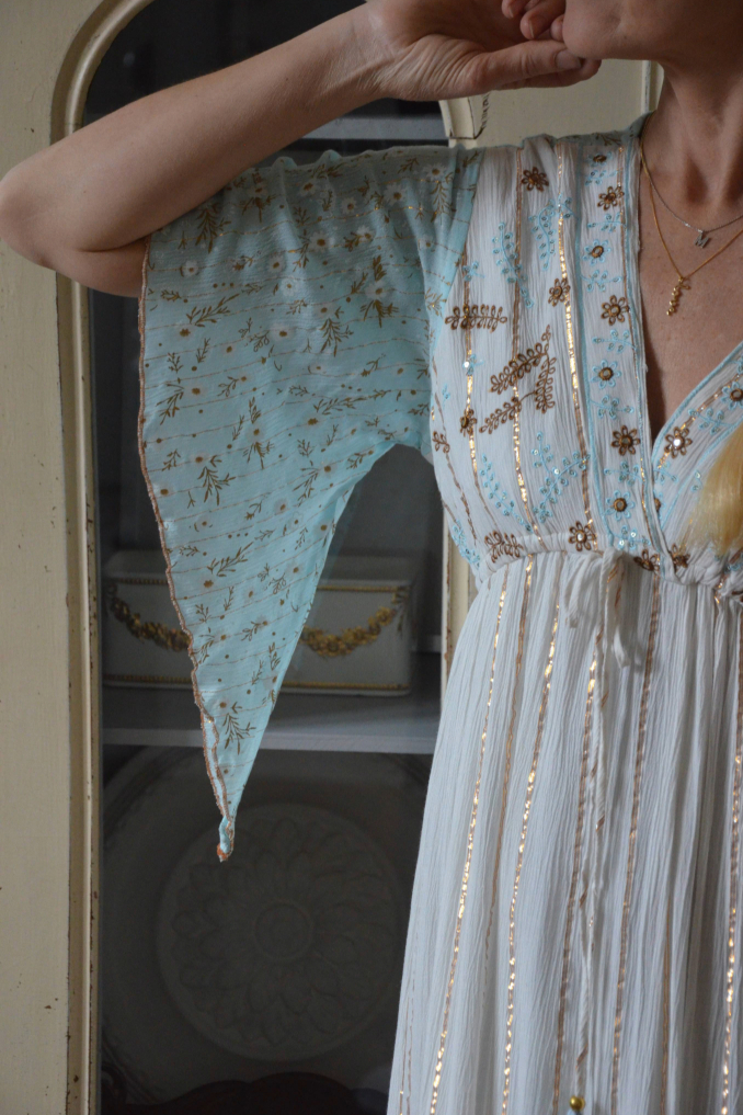Vacker klänning i vitt och turkos med detaljer med det lilla extra som; gulddetaljer, broderier, toffsar, små speglar inuti de broderade blommorna...