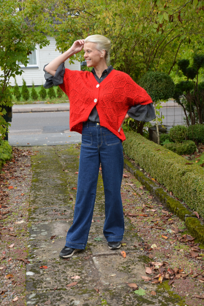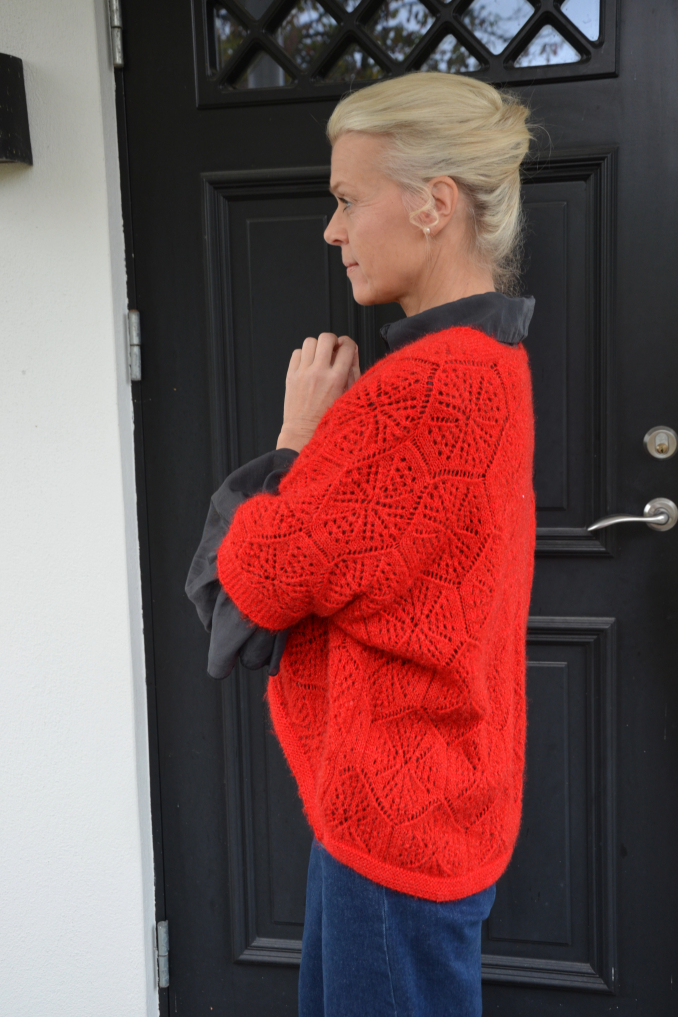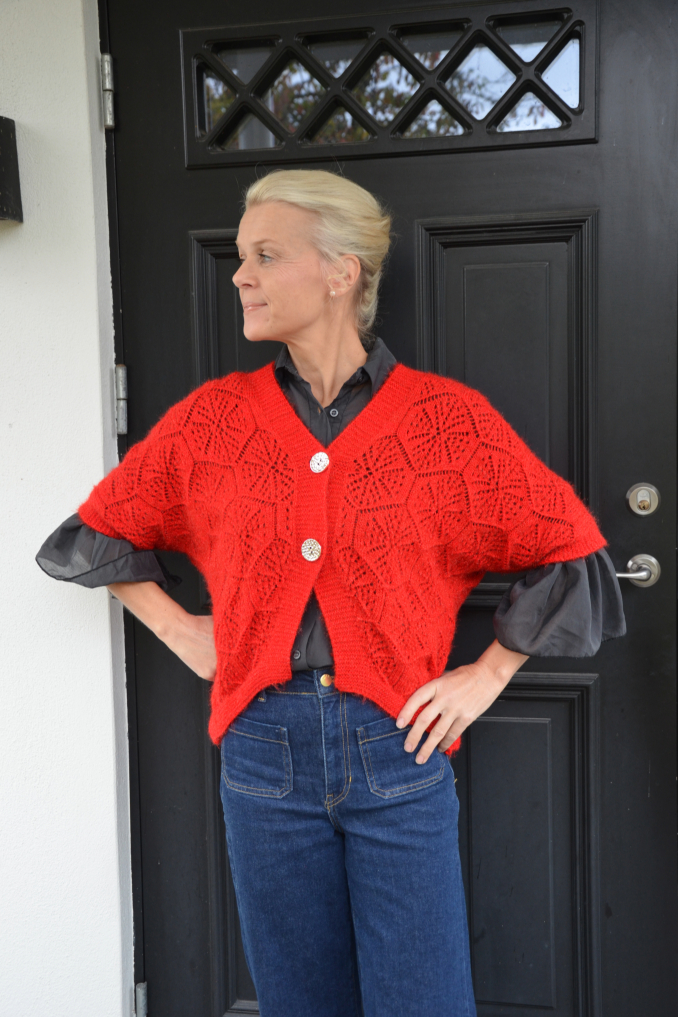 En jättehärlig röd glesstickad kofta med fint mönster och snygga knappar!