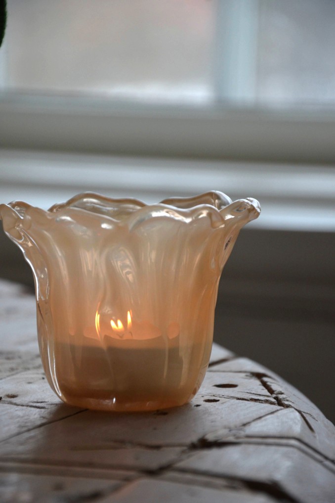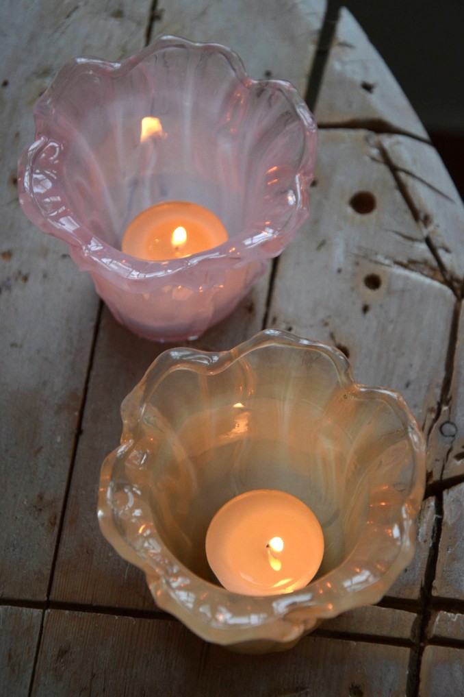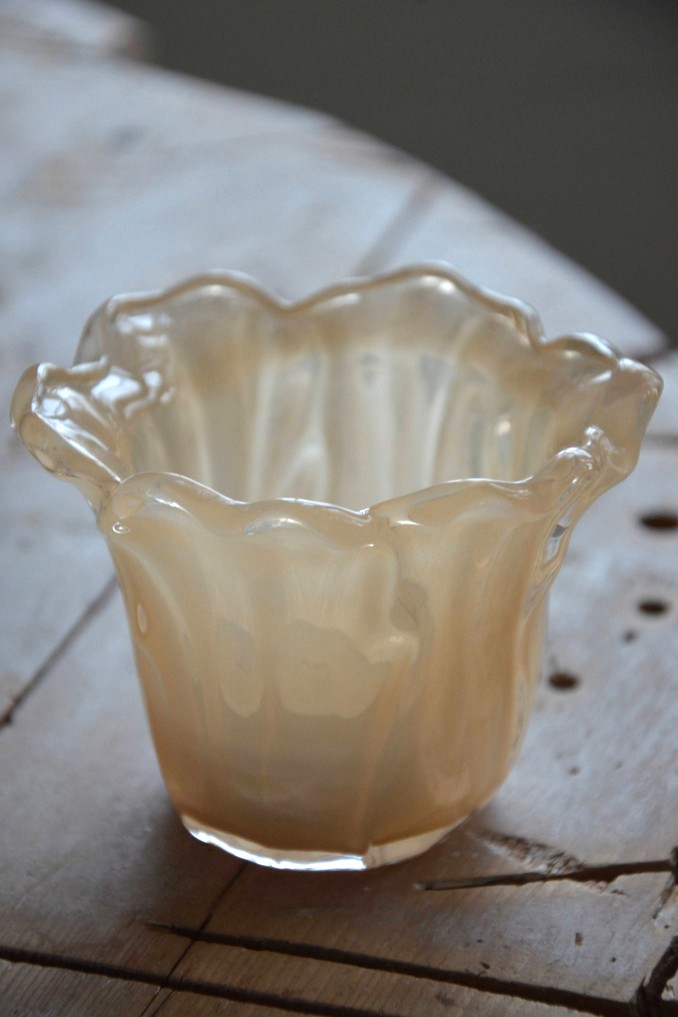 Vacker oregelbunden ljuskopp i glas som sprider ett fint mjukt sken när man tänder ett värmeljus i den...