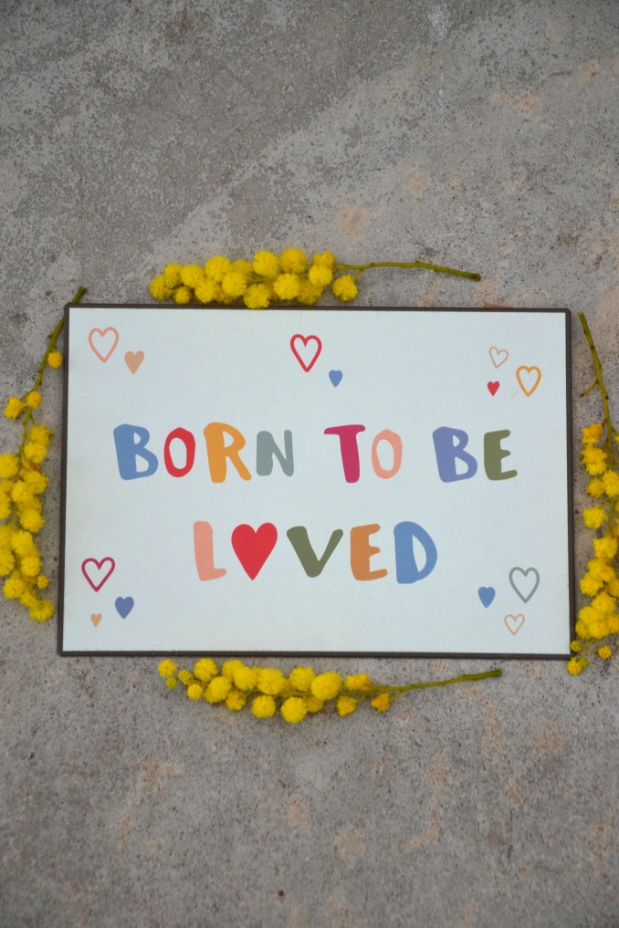 Denna fina skylt med texten BORN TO BE LOVED blir ett fint inslag i tex barnrummet