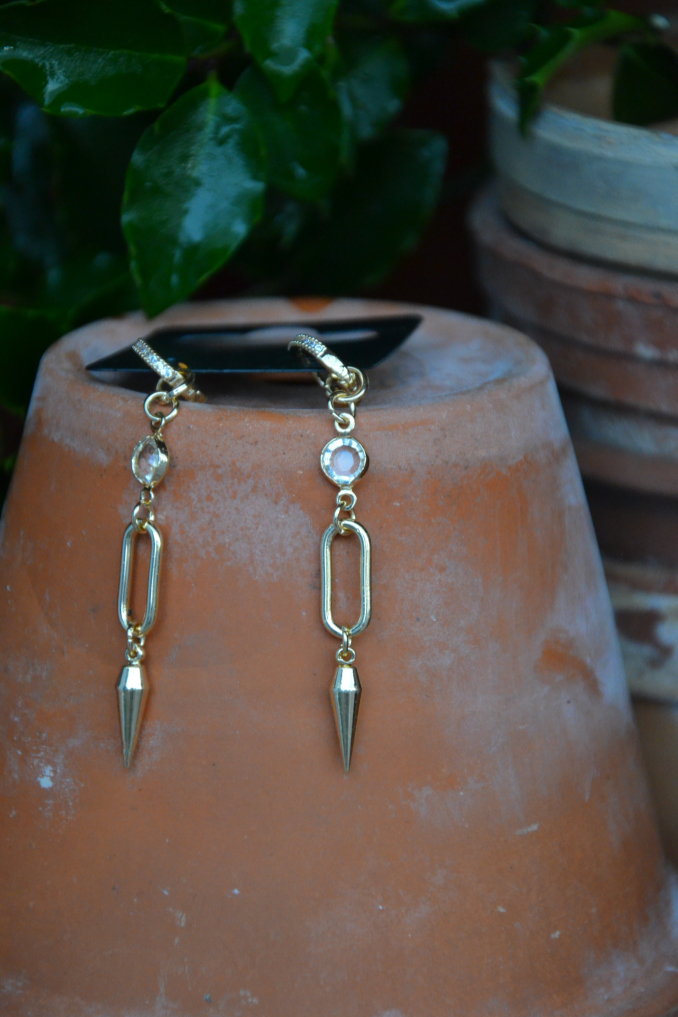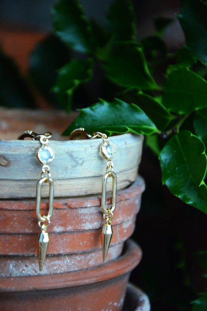 Guldfärgade örhängen med bla klar kristall och örhängena avslutas med en spets nertill
