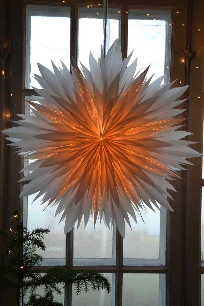 Det är en semitransparent pappersstjärna som skapar magisk känsla i ett fönster...