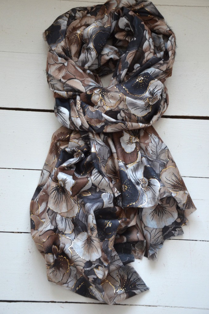 Snygg sjal i beige toner och guldiga inslag på ena sidan