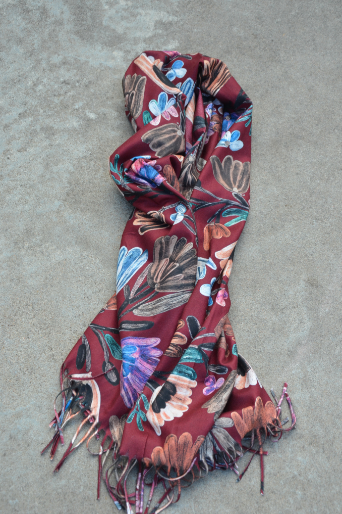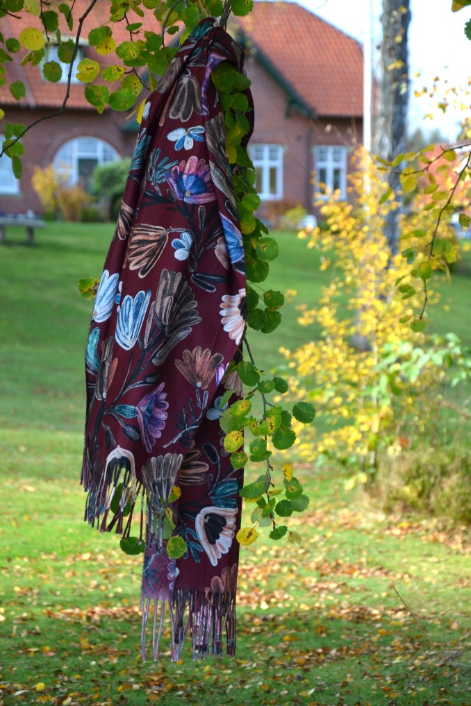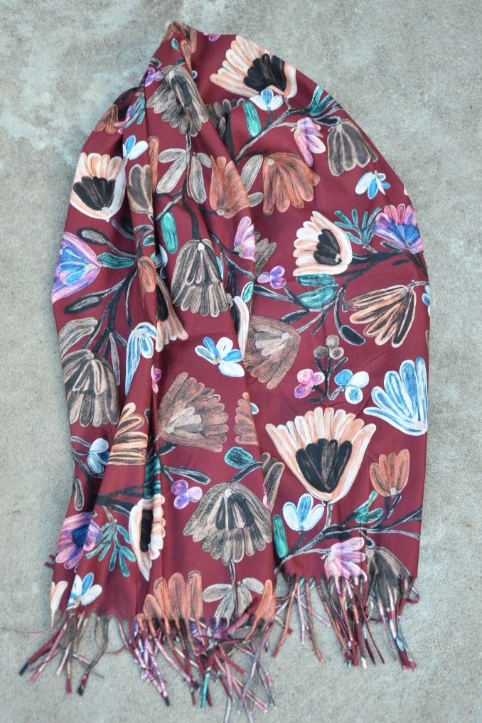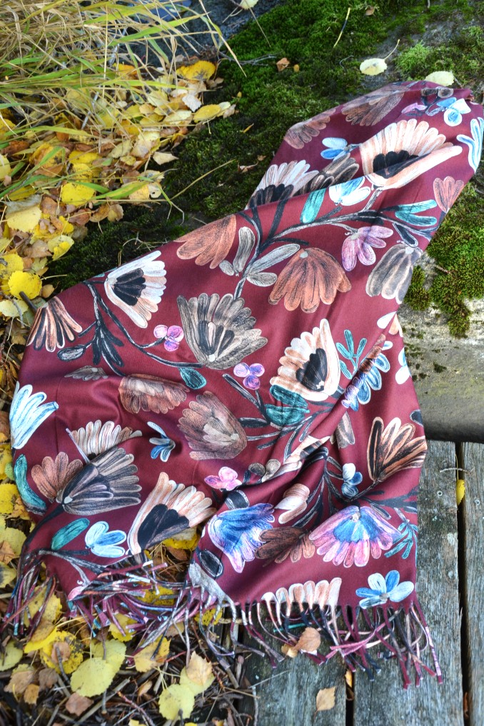 Färgstark sjal med blommor och blad på burgundy färgad botten