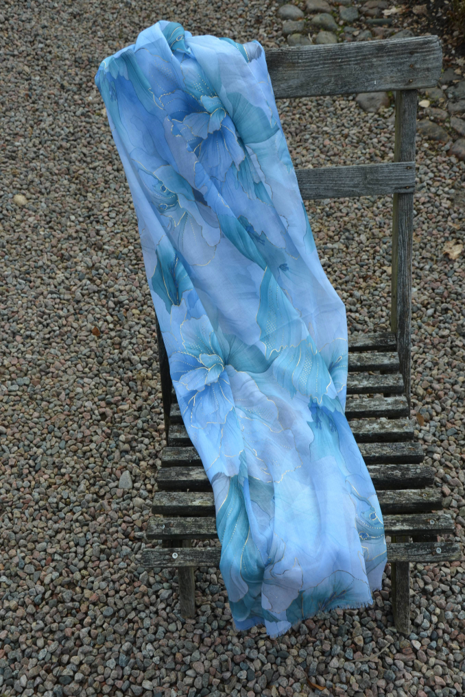 Ljusblå blommig sjal med guldiga inslag som får den att glänsa fint i vårsolen!