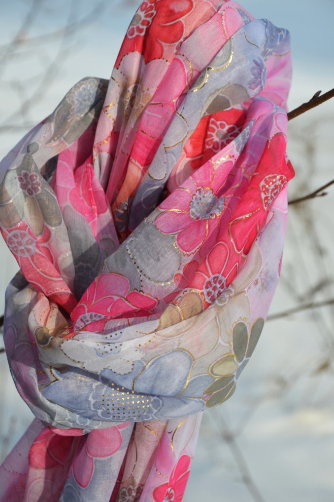 Härlig sjal i mjuka vackra pasteller med motiv av blommor och fina guldinslag som ger det lilla extra till sjalen!